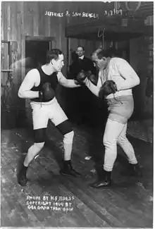 Samuel Berger (t.v.) sparrer med ex-verdensmesteren Jim Jeffries i 1909.