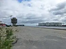 På landsiden mellem Sandkaj og den parallelle Trelleborggade lå der endnu i 2012 to store pakhuse, der var blevet opført i 1913 og 1915 for Københavns Frihavns Selskab A/S,[3] men de blev efterfølgende fjernet. Kun dobbeltsiloerne der var blevet opført af Aalborg Portland i 1979 til opbevaring af cement stod for en stund alene tilbage som et minde om tidligere tider. De blev imidlertid ombygget til to 59 meter høje kontorhuse af Ejendomsselskabet Portland Towers efter tegninger af Design Group Architects i 2013-2014. Rent praktisk blev de nye Portland Towers på den ligeledes nye Göteborg Plads til ved, at kontorerne blev sat udenpå de øvre dele af siloerne. Derved får medarbejderne en god udsigt over kvarteret og København i øvrigt.[4][5]