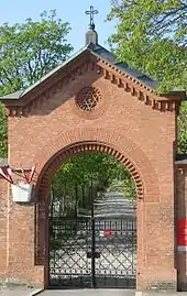 Kommer man ind på kirkegården gennem indgangsporten ved Leberstraße 6-8, finder man en toetages vagtmesterbolig umiddelbart til højre. Til venstre, i et ellers tomt rum, er et informationspanel, hvor lighuset tidligere lå. Her blev kister opbevaret i en periode på 48 timer indtil begravelsen for at minimere risikoen for at begrave personer, der kun tilsyneladende var døde. Hovedstien, der er udformet som en allé, fører direkte fra indgangsporten til kirkegårdens centrum. Begyndelsen af denne allé er flankeret på begge sider af en stenånd med en sænket fakkel. De tilsvarende urnesokler bærer inskriptionerne "Adskillelse er vores skæbne, genforening er vort håb" og "På jordisk adskillelse følger salig forening" .