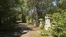 Når man nærmer sig kirkegårdens centrum, udvides hovedstien og slutter til sidst ved et monumentalt stenkirkegårdskors, der forestiller Jesus Kristus korsfæstet. Forsiden af piedestalen bærer indskriften "Jeg er opstandelsen og livet" (Johannesevangeliet 11:25). Området med skaktgravene ligger på begge sider af denne del af alléen. I stedet for de tidligere gravrækker ses her enge med træer og buske. Kun et par erindringsgravsten minder om de talrige begravede her.
