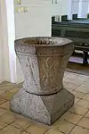 Kirkens døbefont står i korsskæringens sydvestre hjørne. Den er udført i granit på 1200-tallet. Dens usædvanlige ottekantede form indikerer, at den oprindeligt har været lavet til et andet formål. Dette bestyrkes af, at den er kommet til kirken fra Antvorskov Kloster, hvor man ikke havde anvendelse for en døbefont.