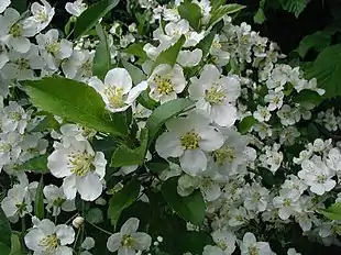 Blomstringen sker i maj-juni, og blomsterne sidder 4-5 sammen i småskærme på små, knudrede dværgskud. Blomsterne er hvide og dufter syrligt-sødt. Frugterne er bittesmå, bærlignende æbler. De er langstilkede og højrøde. Når de er ædt af fuglene, sidder stilkene tilbage som et godt vinterkendetegn. Frøene spirer villigt.