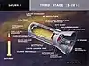 En tretrinsraket som Saturn V, frakobler sektion efter sektion på vejen opad. Den første del består af nogen kraftige raketmotorer der løfter den væk fra jordoverfladen. Efterhånden som disse raketmotorer ikke behøves længere, skiller man sig af med de tomme tanke og motorer, som så bliver erstattet af næste trin som så indeholder mindre motorer og fyldte tanke der er mere passende for belastningen.