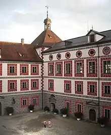 Hovedbygningen på slottet består af fire fløje bygget i et rektangel med tårne i hjørnerne. Eksteriøret dateres tilbage til seneskalk Jakob II af Waldburg (1546–1589) og hans kone Johanna (1548-1613). Efter en brand ødelagde en ældre bygning i 1579 byggede de et nyt slot. Dele af dette blev dog ødelagt i 1646, da svenske tropper under Carl Gustaf Wrangel plyndrede stedet i slutningen af trediveårskrigen og satte ild til det. Spisesalene fik nyt interiør og slottets kapel blev genopbygget i nygotik.[1][2]