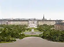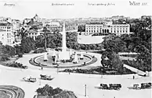Overblik over Schwarzenbergplatz med Hochstrahlbrunnen og i baggrunden Palais Schwarzenberg, år 1905