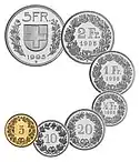 Mønter 5, 10 og 20 rappen. ½, 1, 2 og 5 franc