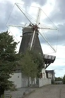 Møllens seks vinger har en speciel historie: I 1893 havde mølleren en konflikt med naboen om naboens høje træer, der tog vinden fra møllen. Da naboen ikke ville fælde sine træer, byggede mølleren sin mølle højere og forsynede den med seks vinger, disse blev i 1899 monteret med klapper.
