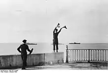 Tysk soldat kommunikerer med semaforflag med tyske marinefartøj ved Frankrigs kyst, oktober 1940.