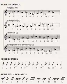 Vigtige "serielle" komponister som Arnold Schoenberg, Anton Webern, Alban Berg, Karlheinz Stockhausen, Pierre Boulez, Luigi Nono og Jean Barraqué gik alle gennem tidsperioder i deres komponistkarriere hvor de til en vis grad brugte denne serielle teknik.