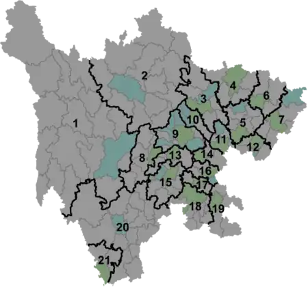 Sichuan er inddelt i 21 enheder på præfekturniveau (Én subprovinsiel by, 17 bypræfekturer og 3 autonome præfekturer).