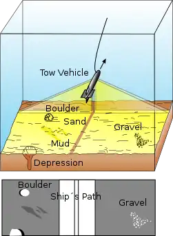 En side-scan anvender en aktiv sonar enhed som udsender en konisk eller vifte-formede pulser ned mod havbunden over en stor vinkel vinkelret på sejlretningen af side-scan sonaren. Side-scan sonaren kan f.ek. blive trukket gennem vandet af et skib ved vandoverfladen, monteret på undersiden af et sejlende skib – eller trukket af en ubåd. Lydstyrken af de akustiske refleksioner fra havbunden fra den vifteformede lydkegle måles skivevis (ca. 1-dimensionelt, linjevis). Disse skivemålinger "sys" senere sammen langs sejlretningen og udgør så et billede.