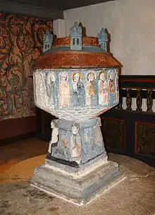 - Skogstibble kirke, Uppland: Skulpteret font fra ca 1200 tilskrevet Sighref.