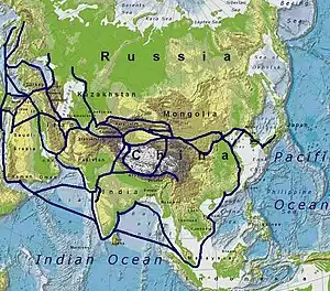 Den mongolske ekspansion på det asiatiske kontinent fra omkring 1215 til 1360 etablerede en usædvanlig politisk stabilitet for området, hvilket medførte en ny blomstring for Silkevejen. Det middelalderlige Mongolske kejserdømme kontrollerede hele den østlige del af Silkevejen og havde sit økonomiske tyngdepunkt i de byer, der var grundlagt langs den; fra Beijing i Kina over Karakorum, Samarkand, Tabriz, Astrakhan, Bahcesaray og Kazan til Erzurum i det i østlige Anatolien. Den mongolske dominans over dette enorme område betød, at en lang række lande, der tilhørte meget forskellige kulturkredse, nu blev bundet sammen politisk, og at kultur og handelsvarer friere kunne blive udvekslet mellem dem.