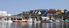 Forskellige typer af bebyggelse i Sisimiut, et præfabrikeret enfamilieshus (venstre) og lejlighedsblokke fra 1960'erne (højre). | ||
