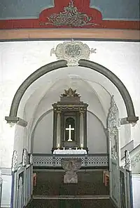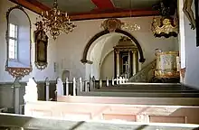 Den runde korbue er bevaret med profilerede kragbånd. Koret har ottedelt hvælv, skibet fladt loft. Ved ombygningen i 1768 fik kirkerummet nyt interiør og blev omdannet til en rokokokirke. Over korbuen ses en kartouche med årstallet 1772 og en religiøs indskrift. Vinduerne er omfattet af kalkmalede rokokoornamenter. Prædikestolen er fra 1771 og altertavlen fra 1783. På nordvæggen ses et korbuekrucifikset fra omkring 1475. I 1930 afdækkede Harald Borre en kalkmalet rankedekoration fra midten af 1500-tallet, desuden påvistes to lag sengotiske kalkmalerier i korhvælvet. Kalkmalerierne blev atter overkalket i 1965.
