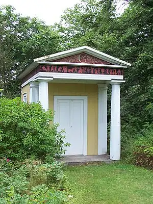 Lysthuset, kaldet Dianatemplet, er inspireret af antikkens templer. Tegningerne er bevaret på Nationalmuseum i Stockholm.