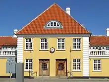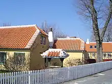 Farven på husene er speciel – skagengul – og karakteristisk er de hvide kanter på tagstenene.