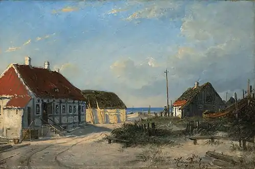 Martinus Rørbye var blandt de første malere der besøgte og malede Skagen. Hans Strandscene fra Gammel Skagen med et optrækkende uvejr er dateret 1834.[27] Flere af hans andre Skagensmalerier stammer fra slutningen af 1840'erne således Et skib på Skagens strand, Stranden ved Skagen Vesterby og Mænd af Skagen en sommeraften i godt vejr.