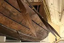 Skibet var bygget med meget lange bordgange, som var låst sammen med et system af trætapper og dyvler med en ny byggeteknik, som har været enestående i antikkens tidsregning, tapsamlinger med udhuggede eller udskårne taphuller indad i plankerne, som så blev sat sammen med trætapper. Dette producerede et fartøj med glat bordlægning, men som egentlige er skalbygget med en skalteknik. Indre afstivning var ikke rejst under bygningen før skallen var gjort færdig. Den egyptiske byggeteknik ved brug af tappesammenføjning i hele Oldtidens Egyptens tidsregning var baseret på løse trætapper, som kun blev limet fast, og som dermed kunne fartøjet skilles ad for transport på land som et byggesæt.