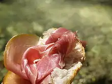 Skiveskåret skinke på brød.