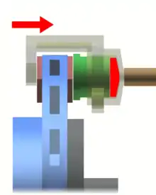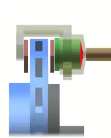 Principskitse af bremsende skivebremse. De brunlige bremsebakkeskiver presses af cylinderen mod den lyseblålige bremseskive.
