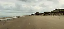 Stranden ved Skiveren set mod nord, spor fra biler der jævnligt kører på stranden ses, i klitterne kan skimtes en tilsandet bunker fra 2. Verdenskrig.