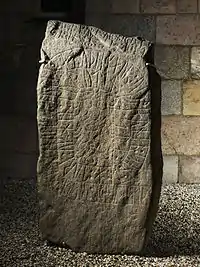 Ved våbenhuset to runesten, den store (fundet i Skjern Slots ruiner): "Sasgerd, Finulvs datter, rejste stenen efter Odinkar, Osbjørns søn, den dyre og hin drottro. en sejdkarl (er) den mand som bryder disse kumler". Den mindre er et fragment.