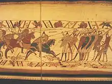 Angelsaksisk skjoldmur mod normannisk kavaleri under slaget ved Hastings (scene fra Bayeux-tapetet).