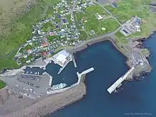 Luftfoto af Skopun havn. - 1981 udvides havnen med et havnebassin.
