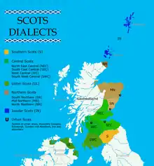 • Nordlige dialekter (Doric): Caithness, Aberdeen, Dundee, det nordøstlige Skotland.