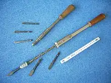 Ret tidligt blev der fremstillet magasinskruetrækkere med udskiftelige klinger, der magasineres i skæftet. Sådanne blev førhen fremstillet helt i jern (stål) og er ofte ganske korte, typisk 3", men er dog set længere, i nutiden med gennemsigtigt plasthæfte.