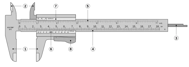 Både linealen og skyderen har en skala som tilsammen gør det muligt at aflæse den målte længde med ned til to hundrededele af en millimeter. Et nulpunkt på skyderens skala (kaldet nonius) "peger" på den målte distance på linealen, og dertil er der yderligere 10, 20 eller (som på billedet) 50 mærker på skyderen: Det mærke der ligger nærmest en millimeter-streg på linealen, indikerer hvor mange 10.-dele, 20.-dele eller, som på billedet, 50.-dele millimeter der skal lægges til den distance som nul-mærket peger på. Nonius´ens tal angiver i dette tilfælde 1/10 (0,10) millimeter.