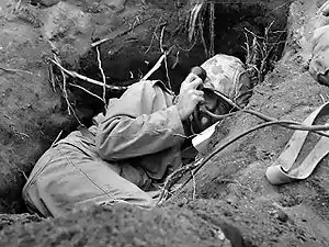En amerikansk marinesoldat kalder artilleriild ind fra sit skyttehul under Slaget om Iwo Jima, 2. verdenskrig