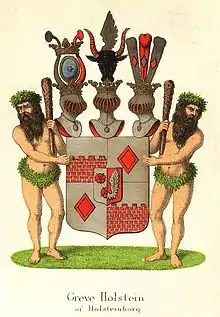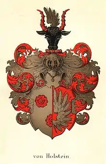 Adam Christopher von Holstein til Netzeband og Buchholtz (1631-1690) — af linjen Fürstenberg som søn af Ulrich Adolph v. Holstein til Buchholz, Fürstenberg, Grabow og Rossow og Barbara Joachimsdatter v. Schwerin — trådte i dansk tjeneste som oberstløjtnant. Han var gift med Cathrine Christine Reventlow af Futterkamp (1647-1704), en søster af storkansler Conrad Reventlow. Blandt hans mange børn skal nævnes storkansleren, grev Ulrich Adolph Holstein (s. d.), generalmajor Ditlev von Holstein (1669-1721), overhofmarskal hos dronning Anna Sophie, senere præses i Politi- og Kommercekollegiet og sidst kongens hofmarskal og stiftamtmand på Sjælland, kammerherre og hvid ridder Christian Frederik von Holstein til Cathrinebjerg (1678-1747) og endelig overjægermester hos dronning Anna Sophie, hvid ridder Henning Christopher von Holstein til Nütschau (1679-1753). Den ældste af disse brødre, Ulrich Adolph, blev 4. september 1700 ophøjet til friherre af Fuirendal og 1. januar 1708 til lensgreve af Holsteinborg med følgende våben: Skjoldet firdelt, 1. og 4. felt tværdelt ved et firtindet tindesnit af sølv og rødt, dannet efter hans mødrene slægts, de Reventlow'ers skjoldmærke, 2. og 3. en rød rude i sølv, ført af hans farmødrene slægt, de Schwerin'er, et hjerteskjold viser slægtens stamvåben. Skjoldet, der holdes af to vildmænd, bærer tre hjelme, den midterste prydet med Holsteinernes eget hjelmtegn, den højre — heraldisk regnet — med et guldrandet, rundt blåt skjold mellem et sølv og et rødt vesselhorn, stukne gennem en krone (hentet fra det grevelige Reventlowske våben), den venstre med Schwerinernes hjelmtegn, en rød strudsfjer mellem to sølv strudsfjer, hver belagt med en rude af modsat farve. Med patent af 6. maj 1729 tildeltes alle lensgreve Ulrich Adolph Holsteins ægte descendenter på sværdsiden lensgrevelig rang, og den 13. april 1733 blev de optaget i Det slesvig-holstenske Ridderskab og blev dermed anerkendt som tyske grever. Med patent af 9. februar 1753 fulgte en efterbevilling på den grevelige titel i tillæg til titlen som baroner af Fuirendal.
