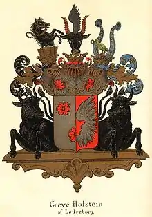 Gehejmeråd Johan Georg von Holstein (1662-1730) af linjen Möllenhagen blev fader til gehejmekonferensråd og blå ridder, grev Johan Ludvig Holstein (1694-1763), der ved patent af 31. marts 1750 blev optaget i den danske lensgrevestand som greve af Ledreborg med alt sit ægte afkom på sværdsiden og med følgende våben: Slægtens skjold uforandret, men prydet med tre hjelme, Holstein'ernes mellem de Vind'ers og Boilow'ers, skjoldholdere to liggende, dobbelthalede sorte tyre. Hans ældste søn, gehejmekonferensråd og blå ridder, grev Christian Frederik Holstein (1735-1799), overvældedes med de højeste embeder; han var således assessor i Højesteret og direktør for Generalpostamtet, blev 1768 overhofmester hos dronning Caroline Mathilde, året efter overstaldmester hos samme, 1772 overhofmarskal og 1780 overjægermester. Hans anden hustru, Charlotte Elisabeth Henriette, f. rigsfriherreinde til Inn- und Knyphausen, udnævntes til dronning Caroline Mathildes overhofmesterinde og overtog efter mandens død stillingen som dekanesse i Vallø. Deres sønnesøns søn, politikeren, konsejlspræsident Johan Ludvig Carl Christian Tido lensgreve Holstein-Ledreborg (1839-1912), blev fader til grevskabets sidste besidder, hofjægermester, dr.polit., grev Josef Johannes Ignatius Maria Holstein (1874-1951).