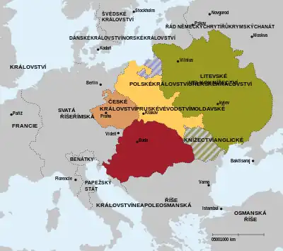 Jagiellonske fyrster var også i stand til at etablere sig som konger i Ungarn, Kroatien og Bøhmen, først i konkurrence, derefter (efter Matthias Corvinus -mellemspillet) i samarbejde med Habsburgerne. Vladislav 2. af Bøhmen, Ungarn og Kroatien regerede i tre lande, ligesom hans søn Ludwig 2.[1] Efter hans uheldige død i 1526 i slaget ved Mohács, blev han arvet af habsburgeren Ferdinand 1. og stormanden Johann Zápolya (sviger til Sigismund 1. og Vladislav 2., og onkel og regent af Ludwig 2.). Zapolya giftede sig også med Sigismunds datter Isabella i 1539 og testamenterede deres søn den ungarske krone med Fyrstendømmet Transsylvanien.