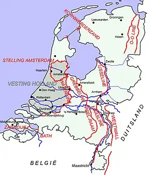 Siden det 17. århundrede havde Holland sat sin lid til et effektivt forsvarssystem, som blev kaldt Vandlinjen (Hollandse Waterlinie), der beskyttede alle de store byer i den vestlige del af landet ved at oversvømme en del af landet. I slutningen af det 19. århundrede var den linje blevet moderniseret med fæstninger og flyttet længere mod øst, forbi byen Utrecht. Denne linje blev kaldt den Nye vandlinje. Da befæstningerne var forældede i 1940, blev de forstærket med nye bunkers. Linjen lå på den yderste kant af området, der lå under havets overflade, Det betød, at landet foran befæstningerne let kunne sættes under en meter vand – for lavt til både, men dybt nok til at gennemvæde jorden og gøre den til et ælte, der var umuligt at forcere. Området vest for den Nye Vandlinje kaldtes Vesting Holland ('Fæstning Holland'). Områdets østlige flanke var beskyttet af Isselsøen, og den sydlige flanke var beskyttet af de tre parallelle vandveje: Rhinens to løb og Meuse. De virkede som en National Skanse. Inden krigen var det planen at falde tilbage til denne stilling næsten med det samme, i håb om at Tyskland kun ville invadere den sydlige del af landet på vej til Belgien og efterlade hovedparten af Holland uskadt. I 1939 kom det til at stå klart, at en sådan holdning i grunden var en invitation til at invadere og gjorde det umuligt at forhandle med de allierede om et fælles forsvar. Der blev derfor bygget en hovedforsvarslinje længere østpå.