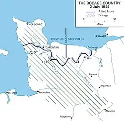 Bocage-landskabet var kendetegnet ved at bestå af små marker, som var omgivet af høje hække, hulveje og små vandløb, som gav de tyske forsvarere store fordele og forhindrede de allierede tropper i at trænge frem, så først den 29. juni kunne landoffensiven i retning af byen indledes af dele af det amerikanske 19. korps. Da den tyske modstand viste sig stærkere end ventet, havde de allierede større tab end forudset. Alene 19. korps havde tab på næsten 11.000 mand. [2]. Til sidst omringede de allierede byen, og den egentlige kamp om byen begyndte den 15. juli 1944. Bykampene fortsatte til slutningen af juli.[3] [4].