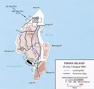 2. og 4. marinedivision gik i land på øen den 24. juli 1944 og fik støtte af flådebombardementer og artilleri som blev affyret på den anden side af strædet Saipan. En taktisk finte mod den store bosættelse på Tinian by afledte forsvarerne fra det egentlige sted for amerikanernes landgang på nordsiden af øen. Slagskibet USS Colorado og destroyeren USS Norman Scott blev begge ramt af japanske 15,2 cm kystbatterier. USS Colorado blev ramt 22 gange og 44 personer mistet livet. USS Norman Scott blev udsat for seks bomber og disse bombene førte til at kaptajnen Seymore Owens og 22 af hans mandskab døde.
