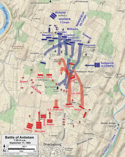 Slaget begyndte ved daggry omkring kl. 5.30 den 17. september med et angreb langs Hagerstown Turnpike af Unionens I korps under Joseph Hooker. Hookers mål var plateauet hvorpå Dunker Church lå. Kirken var en beskeden kalket bygning som tilhørte den lokale menighed af tyske baptister. Hooker havde omkring 8.600 mand, hvilket var lidt mere end de 7.700 forsvarere under Stonewall Jackson, og denne forskel blev mere end opvejet af, at sydstatshæren lå i en stærk forsvarsposition.[11] Abner Doubledays division rykkede frem på Hookers højre side, James Ricketts' rykke på venstre side ind i East Woods, og George Meades Pennsylvania Reserves division udfoldede sig i centrum og en smule bagved. Jacksons forsvar bestod af divisionerne under Alexander Lawton og John R. Jones på linje fra West Woods over hovedvejen (turnpike) og langs den sydlige ende af Millers majsmark. Fire brigader blev holdt i reserve inde i West Woods.[12]