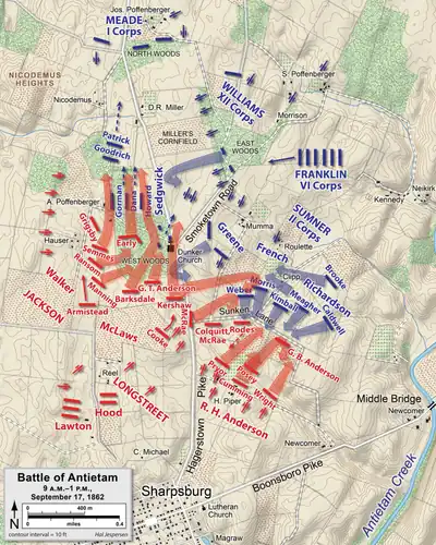 Efter at have forfulgt Sydstaternes hær under general Robert E. Lee ind i Maryland, igangsatte Unionshæren under generalmajor George B. McClellan en række angreb mod Lees hær som lå i defensive stillinger bag Antietam Creek. Ved daggry den 17. september igangsatte generalmajor Joseph Hooker's korps et kraftigt angreb mod Lees venstre flanke. Angreb og modangreb bølgede hen over Millers majsmark og kampen opslugte Dunker Church. Unionsangreb mod hulvejen gennembrød efterhånden Sydstatshærens centrum men Unionshæren udnyttede ikke fordelen. Om eftermiddagen gik generalmajor Ambrose Burnside's korps i aktion og erobrede en stenbro over Antietam Creek og rykkede frem mod Sydstatshærens højre fløj. På et afgørende tidspunkt ankom generalmajor A.P. Hill's division fra Harpers Ferry og iværksatte et overraskende modangreb, som drev Burnside tilbage og afsluttede slaget. Selv om han var i undertal 2:1 sendte Lee hele sin styrke i kamp, mens McClellan bruge mindre end trefjerdedele af sin hær, hvilket muliggjorde at Lee kunne stoppe de føderale styrker. I løbet af natten konsoliderede begge sider deres linjer. Trods de voldsomme tab fortsatte Lee med at forpostfægte med McClellan hele den 18. september mens han trak sin anslagne hær syd for floden.[2]