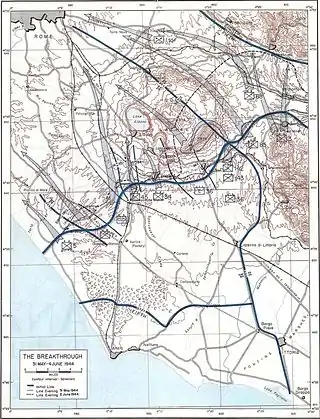 For at øge presset yderligere gav Clark 2. amerikanske korps, som havde kæmpet sig vej langs kysten fra Gustavlinjen og havde sluttet sig til 6. korps den 25. maj, ordre til at angribe højre om Albanerbjergene og rykke frem langs hovedvej 6 til Rom.