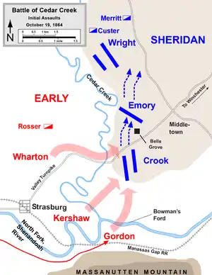 Early indsatte sine mænd i tre kolonner i en vovelig natlig march, som kun blev oplyst af månen. Generalmajor John B. Gordons division tog af sted kl. 20 og fulgte en snæver vej langs foden af Massanutten Mountain og over floden. Lige inden solopgang og under dække af tæt tåge slog Gordon til. Overraskelsen var fuldstændig, og det 8. unionskorps under generalmajor George Crook blev jaget på flugt efter en kort kamp. Der blev taget hundredvis af fanger, hvoraf mange stadig var i nattøj.