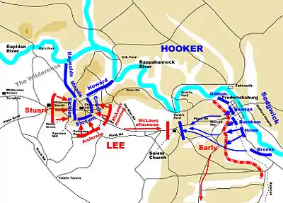 Den 27. og 28. april overskred de fire korps fra Army of the Potomac Rappahannock og Rapidan floderne på flere steder, de fleste nær stedet, hvor de to floder mødes og ved den lille landsby Chancellorsville, som ikke bestod af meget mere end et stort gods, der ejedes af Chancellor familien, ved vejkrydset mellem Orange Turnpike og Orange Plank Road. I mellemtiden havde den anden styrke på mere end 30.000 mand under generalmajor John Sedgwick krydset Rappahannock ved Fredericksburg, og Stonemans kavaleri rykkede frem mod Lees bagland.
