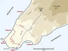 Landsætningen ved Helles blev foretaget af den 29. division under kommando af generalmajor Aylmer Hunter-Weston på fem strande i en bue rundt om halvøens spids. Strandene blev fra øst mod vest kaldt S, V, W, X og Y.