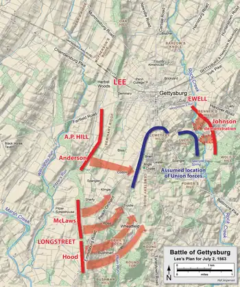 Lees slagplan for 2. juli gik ud på at Longstreets 1. Korps i det skjulte skulle placere sig, så det kunne angribe unionshærens venstre flanke mod nordøst langs Emmitsburg Road og oprulle den føderale linje. Angrebet skulle indledes af generalmajorne John Bell Hoods og Lafayette McLawss divisioner, efterfulgt af generalmajor Richard H. Andersons division af Hills 3. Korps. Den fremadskridende sekvens af angrebet skulle forhindre at Meade kunne flytte tropper fra centrum til sin venstre fløj. Samtidig skulle generalmajor Edward Johnsons og Jubal A. Earlys divisioner fra 2. Korps gennemføre et skinangreb på Unionens højre fløj mod Culp's og Cemetery Hill (igen for at undgå at unionstropper blev flyttet ud på venstre fløj), og hvis lejlighed bød sig skulle skinangrebet udvikles til et helhjertet angreb.[40]