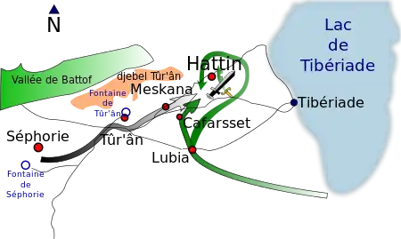 I slutningen af maj samlede Saladin den største hær, han nogensinde havde befalet på Golanhøjderne, omkring 40.000 mænd inklusive et regulært kavaleri på ca. 12.000.[10][22] Han inspicerede sine styrker ved Tell-Ashtara, inden han krydsede floden Jordan den 30. juni.[10] Saladin havde også uventet opnået en alliance med det druserne med base i Sarahmul ledet af Jamal ad-Din Hajji, hvis far Karama var en gammel allieret med Nur ad-Din Zangi, Saladins onkel.[23] Byen Sarahmul var blevet hærget af korsfarerne ved forskellige lejligheder og ifølge Jamal ad-Din Hajji havde korsfarerne endda fået assasinere til at dræbe hans tre ældre brødre. Saladins hær var organiseret med en midte og to flanker: Gökböri befalede venstre flanke, Saladin selv befalede midten og hans nevø, Al-Muzaffar Umar (Taki ad-Din), højre flanke.[24][25]