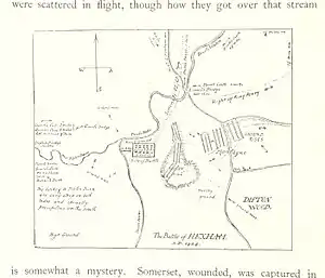Det antages, at Somerset i en fart bragte sine styrker til et sted nær Linnels Bridge og opstillede sine tropper i tre dele på en eng nær Devil's Water, hvor han håbede, at han kunne møde York-hæren, inden den rykkede forbi ham ind i Hexham. Lancaster-tropperne havde næppe indtaget deres stillinger, da York-styrkerne angreb deres stillinger oppe fra. Da de så York-hæren trænge frem, vendte den højre flanke af Lancaster-hæren under ledelse af Lord Ros sig om og flygtede over Devil's Water og ind i Hexham uden et eneste sværdslag. Resterne af Somersets styrke var nu i en håbløs situation, omringet og ude af stand til at manøvrere sig. York-tropperne angreb gennem den ene åbning i den østlige ende af Linnel's Meadow og stødte ind de forvirrede Lancaster-soldater.