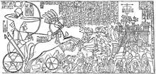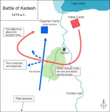 Ramses II, søn af Seti I, besluttede at føre krig mod hittitterriget under kong Muwatallis og dennes allierede. Ramses delte sin hær op i fire store grupper og en mindre. Den mindste gruppe skulle sejle til Libanon og gå i land i nærheden af Byblos og derfra marchere mod Kadesh, en fæstning ved Orontes-floden i det nuværende Syrien. De fire store grupper skulle, adskilt med en dagsmarch, marchere gennem ørkenen. Planen var at overraske hittitterkongen, som mentes at opholde sig i fæstningen (det gjorde han ikke). To hærafdelinger var gået over Orontes, da man fra hittitiske agenter fik den fejlagtige oplysning, at hittitterne havde trukket sig tilbage. Kort efter blev den anden ægyptiske hærafdeling angrebet af en stor hittittisk styrke med 1000 stridsvogne og næsten udryddet. Ramses og den første hærafdeling forskansede sig på et bjerg, hvor de blev kraftigt angrebet af den hittittiske hær. Det lykkedes at erobre det meste af lejren, da den hærafdeling, der var sejlet til Libanon, nåede frem og kunne undsætte farao og fordrive de uorganiserede og plyndrende hittitter, der trak sig tilbage til Kadesh. Ægypterne trak sig derpå tilbage og mødtes med de to bagerste hærafdelinger. Ramses lod felttoget fejre som en stor sejr og tog selv æren for egenhændigt at have slået stridsvognene tilbage.