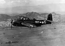 ![]() Eskorthangarskibe USS Gambier Bay i brand efter tidligere at være blevet ramt af granater bliver ramt af en salve fra en japansk krydser (svagt synlig i baggrunden) kort før den sank under Slaget ved Samar. |